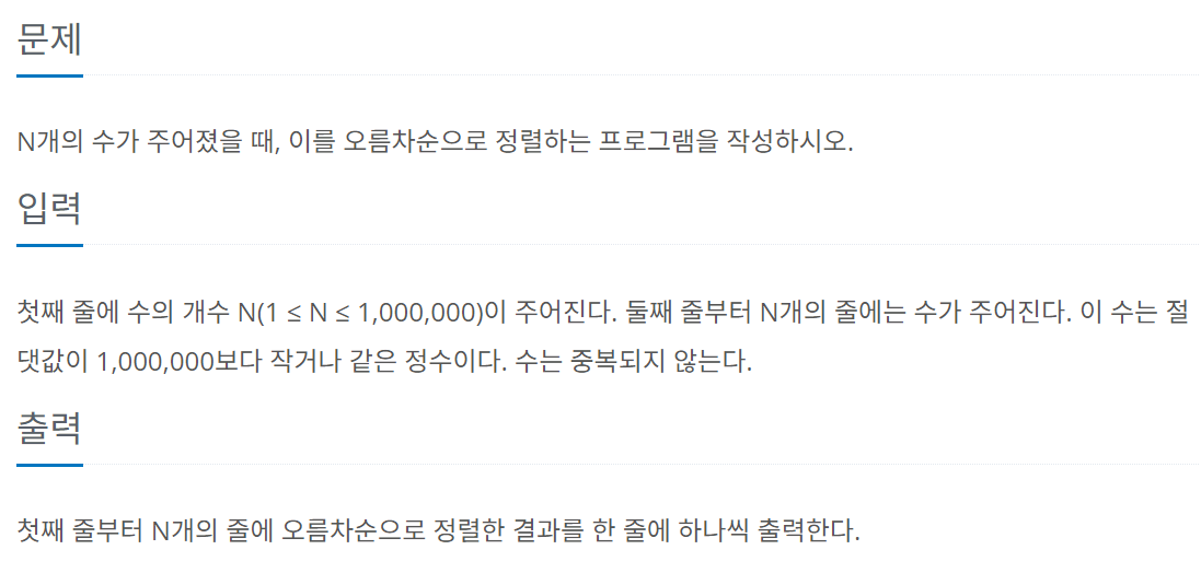 이유는 2750번은 첫째줄에 주어진 수의 개수가 1 ≤ N ≤ 1,000 이었는데, 해당 문제는 1 ≤ N ≤ 1,000,000 이었기 때문에 시간초과 오류가 난것이었다.
