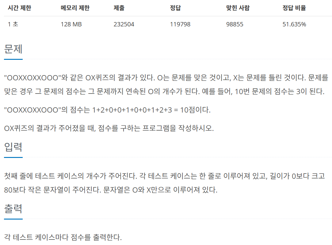 각 O는 1점이고 X는 0점이며 연속으로 답을 맞췄을 경우 그 연속된 문제까지의 점수를 더해주면된다.