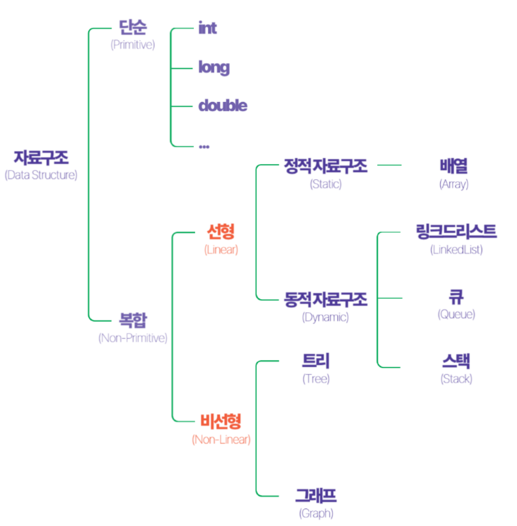 자료구조는 단순 자료구조(Primitive Data Structure)와 복합 자료구조(Non-Primitive Data Structure)로 나뉜다.